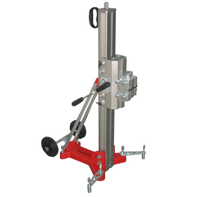 Diamant-Kernbohrstativ der Spitzenklasse erfüllt jeden Anspruch an Steifigkeit auch bei extrem grossen Antriebsleistungen für grosse Bohrdurchmesser. Besonders gute Kraftübertragung durch die direkt aufgearbeitete vorne liegende Zahnstange. Deckenabsrützung, Fahrgestell, Motorschnellwechselsystem im Lieferumfang enthalten.