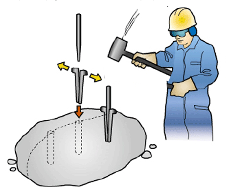 Nach dem Bohren mit dem Monoblocbohrer siehe Bild unten werden Felsen mittels Keile und Feder gesprengt !